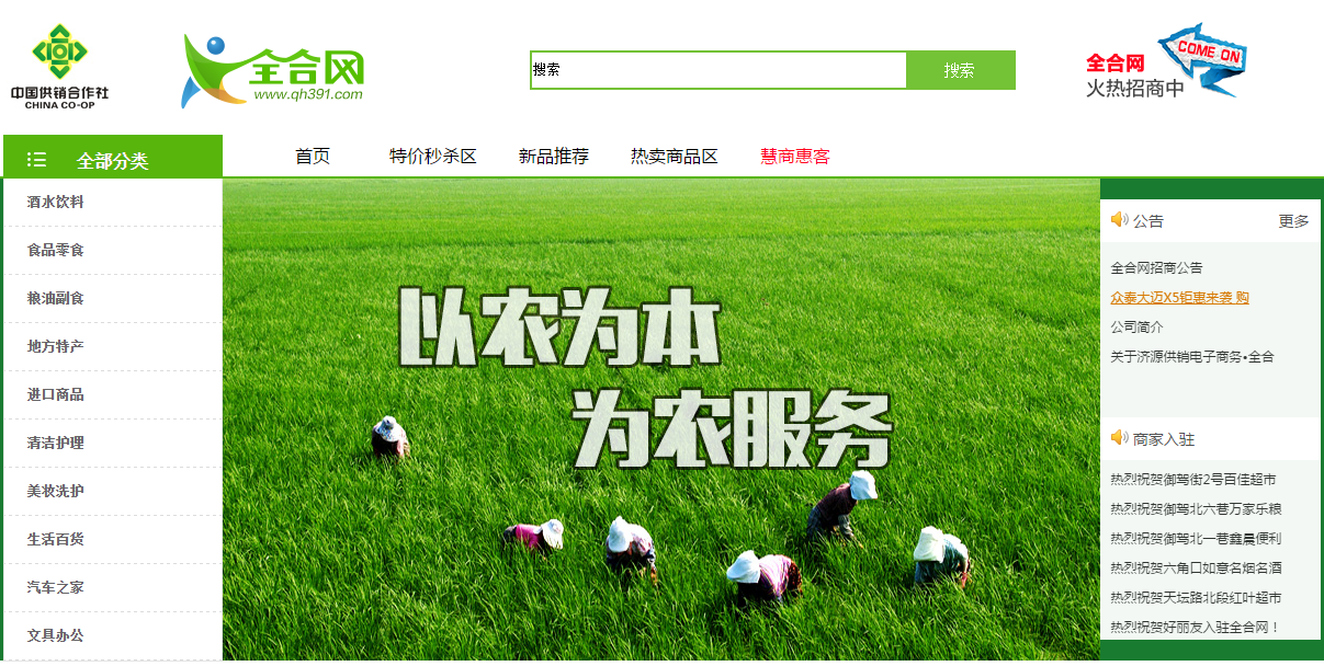 全合網(wǎng)是濟(jì)源市供銷社控股企業(yè)運(yùn)營(yíng)的電子商務(wù)平臺(tái),由河南元豐科技網(wǎng)絡(luò)股份有限公司負(fù)責(zé)平臺(tái)研發(fā)。該平臺(tái)是集批發(fā)、零售于一體的B2B2C網(wǎng)上交易平臺(tái)。本著“整合、發(fā)展、互助、共贏”的原則,與食品、洗化、百貨、煙酒、文具娛樂(lè)、汽車車飾經(jīng)銷商等行業(yè)以及本地的土特產(chǎn)品、工業(yè)品企業(yè)、經(jīng)營(yíng)商戶加盟合作,攜手共同開創(chuàng)電子商務(wù)合作新模式。